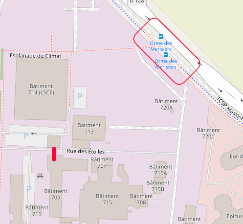 The meeting will take place in the Cassini room of the Department of Astrophysics, house 709, situated on the Orme des Merisiers Campus of the CEA Paris-Saclay site. In the map below the location of the buss stop is circled, and the position of the DAp building is marked by the red line.